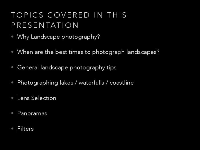 On October 11th, Darrell Harrington gave an excellent presentation on landscape photography to the Flagpole Photographers camera club. Darrell covered the full range of the topic from the different types of crampons one can use on boots for various weather conditions to the importance of showering with your tripod after shooting in saltwater conditions. Because the members of the Flagpole club had registered interest in learning more about photographing water in a recent survey, Darrell deliberately spent time focusing on how he personally goes about making landscape images that include waterfalls, lakes, and seashores. This included the use of ND filters to create the special effect of blurred water and cloud motion and the use of polarizer filters to reduce glare, enrich colors, and bring out detail. Darrell also spent time explaining the details of creating multiple shot panoramic images and the special equipment, such as nodal slide rails, L-brackets, and leveling devices, that help facilitate panorama shooting. Much, much more was also included in this presentation, all of which gave us insight into Darrellโs extraordinary passion for landscape photography and the skill that is always reflected in his impressive images.